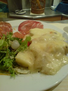 Der Käse-Laib wird unter dem Heizelement platziert und rasch entwickelt sich der betörende Duft zur Schmelze, während die Dame am Tresen den Teller vorbereitet mit Schinken, Salat und Kartoffeln.