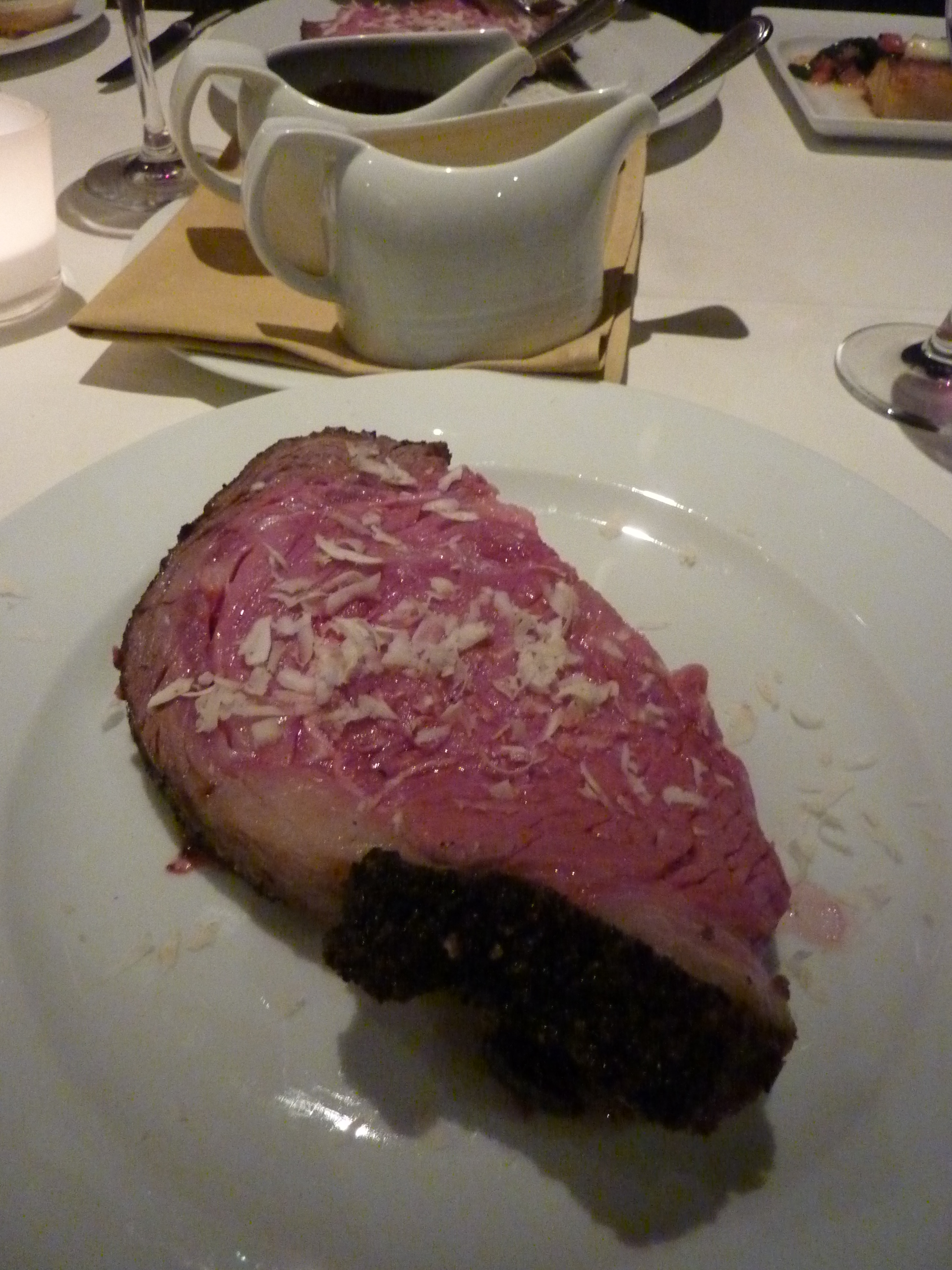 Verschieden Größen und Dicken werden offeriert, in der Regel im Bereich 35 bis 45 Euro. Drei Beilagen sind inklusive und beliebig wählbar, beispielsweise Kartoffelgratin, Bohnen, Spinat, Kartofelpürree oder ein Teller vom Salatbüffett. Eine zu feste Sauce Bernaise, eine zu intensive Portweinreduktion und sehr passende Meerrettichspäne kommen zusätzlich dazu. Auf dem Tisch ergänzt eine Schokoladen-Salz-Mischung und ein Kräuterpfeffer das Ensemble.