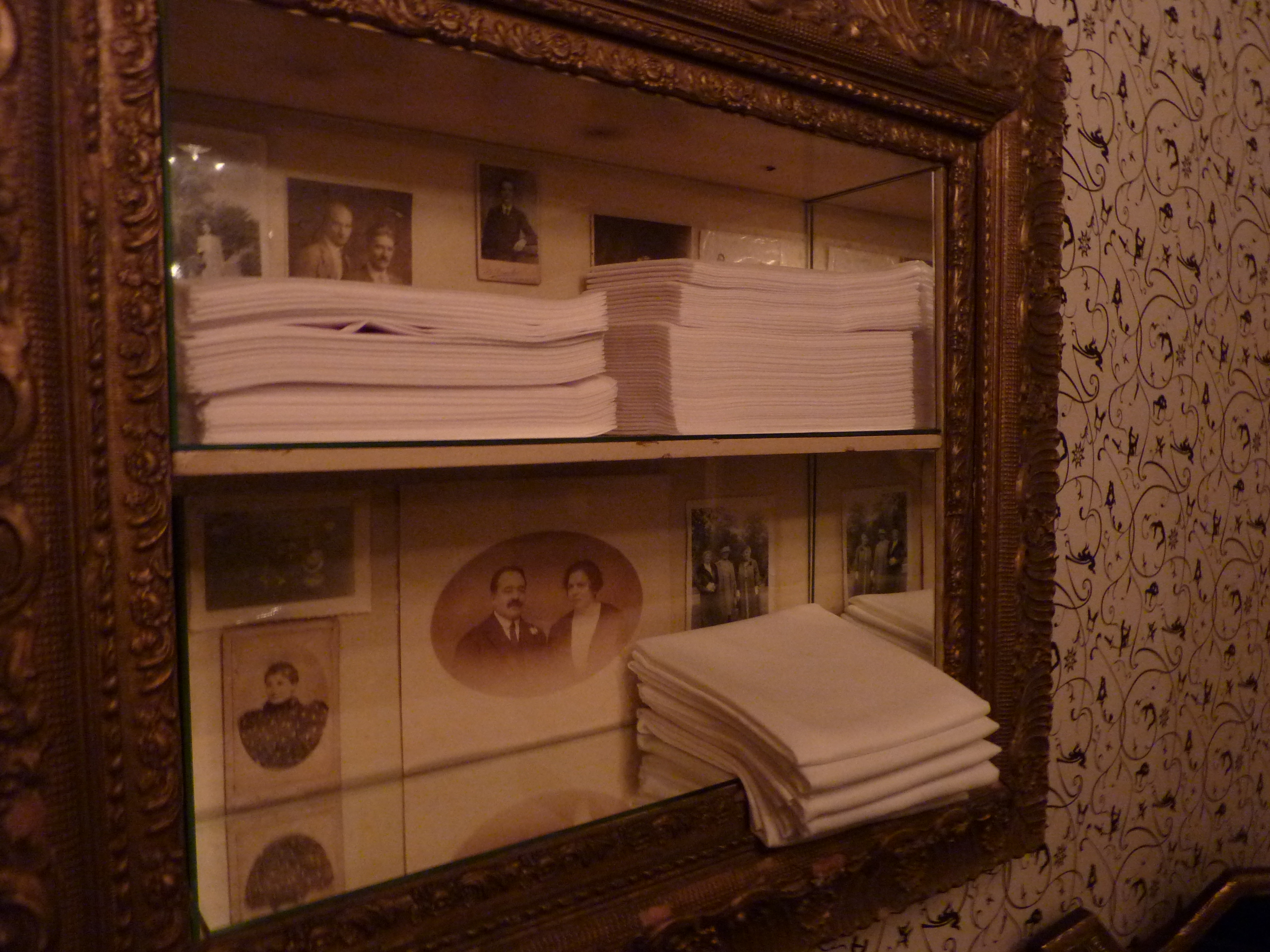 Neben der Handtuch-Ablage ist die Tapete erkennbar, die auf den ersten Blick klassisch-verspielt wirkt, auf den zweiten Blick aber mit einer Art Jugendstil-Kamasutra erröten läßt. Hierbei sei angemerkt, dass im Gegensatz zu 1900, dieses heutige „Hotel“ auf den Punkt der Prostitution dann doch verzichtet. Denke ich…